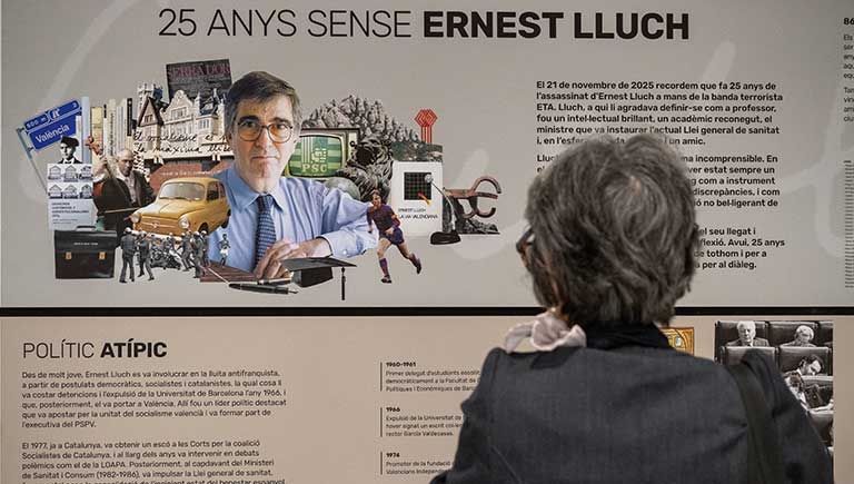 La mostra, organitzada per la Fundació Ernest Lluch i TMB, és un reconeixement a la labor d’aquest personatge històric i convida el públic a repassar la seva trajectòria acadèmica i a recordar el seu llegat en el marc del 25è aniversari de la seva pèrdua.