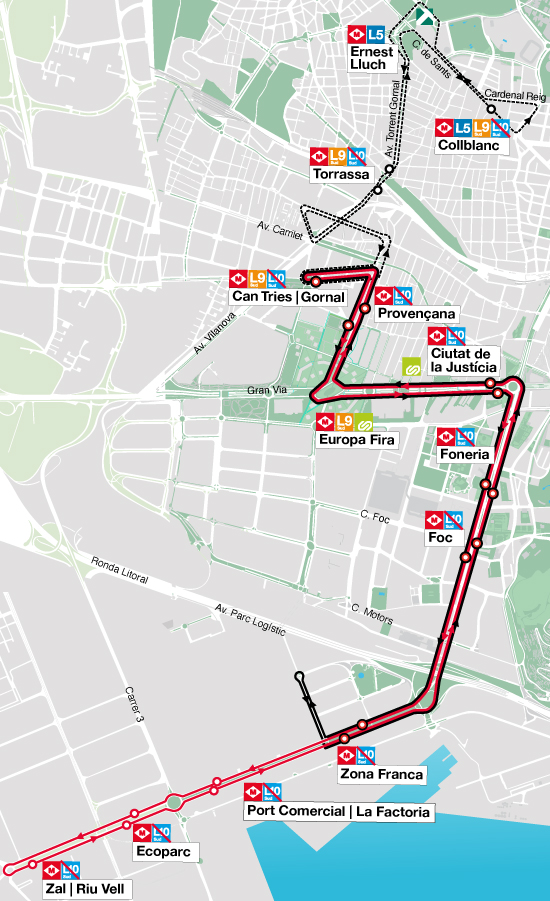 - Nit de diumenge a dilluns (vigilia de festiu): servei desde Zona Franca a Collblanc, de 0 a 2 h (darrera sortida des de Zona Franca: 1.27h).
