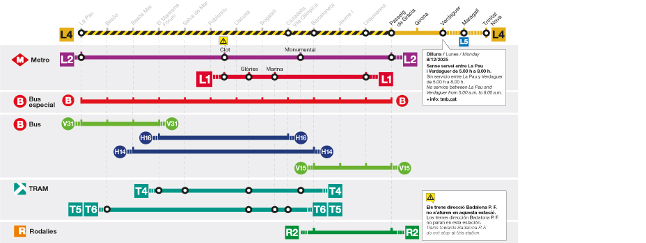 Des del 6 de desembre, i fins a la finalització del servei del 8 de desembre de 2025, el tram de l'L4 entre La Pau i Passeig de Gràcia quedarà sense servei per obres de millora a la infraestructura.