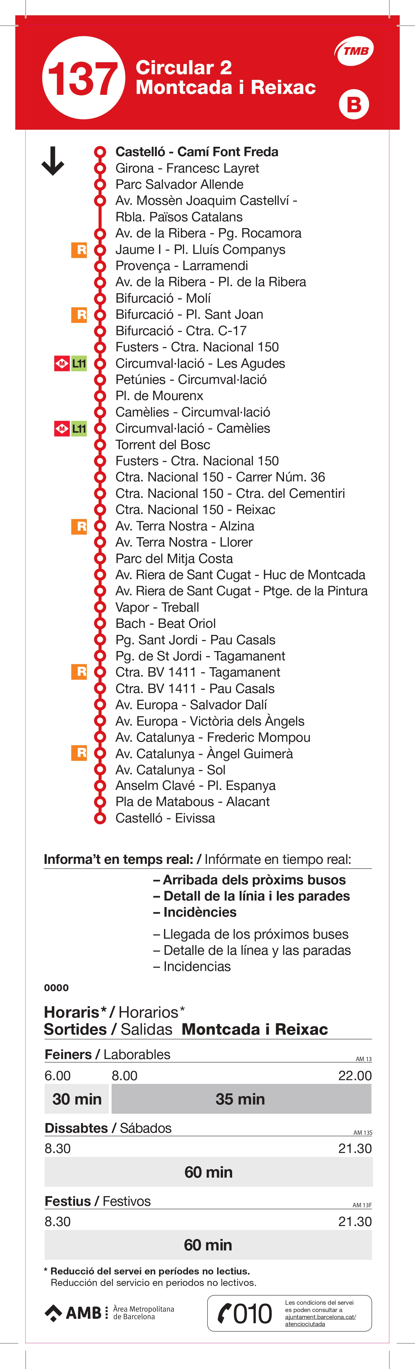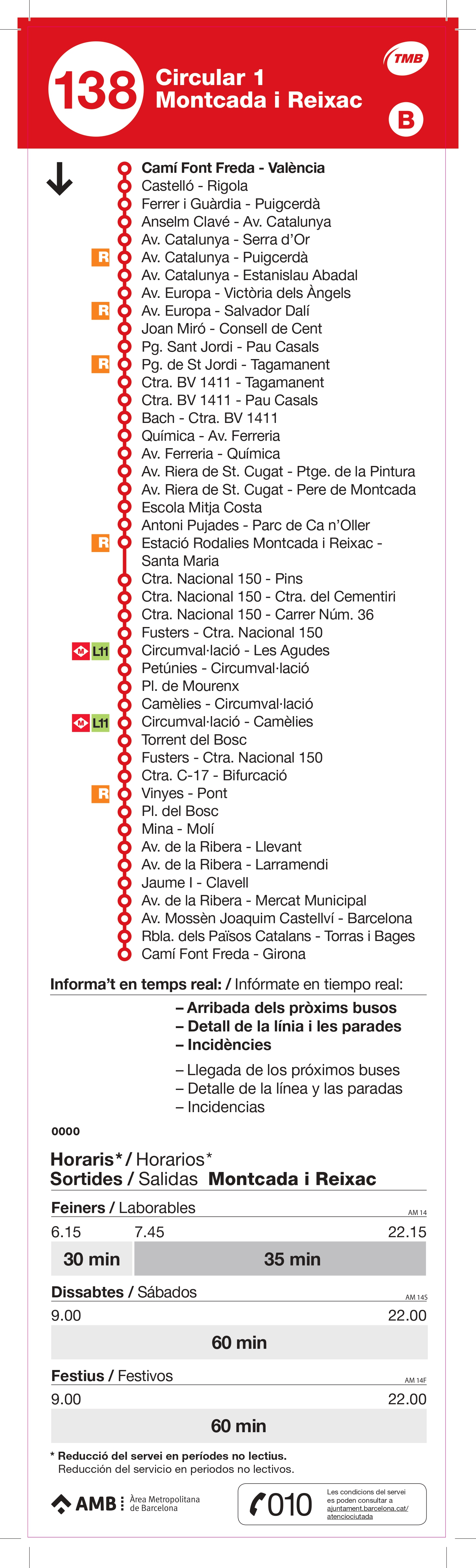- 2935 - Camí Fontfreda - València, 2936 - Castelló - Rigola, 3153 - Ferrer i Guàrdia - Puigcerdà, 1213 - Anselm Clavé - Av Catalunya, 1452 - Av Catalunya - Serra d'Or, 594 - Av Catalunya - Puigcerdà, 3147 - Av Catalunya - Estanislau Abadal, 3778 - Av Europa - Victòria dels Àngels, 3926 - Av Europa - Salvador Dalí, 3277 - Joan Miró - Consell de Cent, 2806 - Pg Sant Jordi - Pau Casals, 3272 - Pg de St Jordi - Tagamanent, 3155 - Ctra BV 1411 - Tagamanent, 2408 - Ctra BV 1411 - Pau Casals, 2409 - Bach - Ctra BV 1411, 3421 - Química - Av Ferreria, 2410 - Av Ferreria - Química, 2705 - Av Riera de Sant Cugat - Ptge de la Pintura, 979 - Av Riera de Sant Cugat - Pere de Montcada, 3839 - Escola Mitja Costa, 3840 - Antoni Pujades - Parc de Ca n'Oller, 3841 - Estació Rodalies Montcada i Reixac - Santa Maria, 3928 - Ctra Nacional 150 - Pins, 3929 - Ctra Nacional 150 - Ctra del Cementiri, 3930 - Ctra Nacional 150 - Carrer Núm 36, 1696 - Fusters - Ctra Nacional 150, 1349 - Circumval·lació - Les Agudes, 3173 - Petúnies - Circumval·lació, 2146 - Pl de Mourenx, 2147 - Camèlies - Circumval·lació, 2148 - Circumval·lació - Camèlies, 1350 - Torrent del Bosc, 1701 - Fusters - Ctra Nacional 150, 115 - Ctra C-17 - Bifurcació, 116 - Vinyes - Pont, 111 - Pl del Bosc, 1457 - Mina - Molí, 1552 - Av de la Ribera - Llevant, 3414 - Av de la Ribera - Larramendi, 3925 - Jaume I - Clavell, 638 - Av de la Ribera - Mercat Municipal, 1715 - Av Mossèn Joaquim Castellví - Barcelona, 1716 - Rambla dels Països Catalans - Torras i Bages, 3412 - Camí de la Font Freda - Girona y 2935 - Camí Fontfreda - València.
